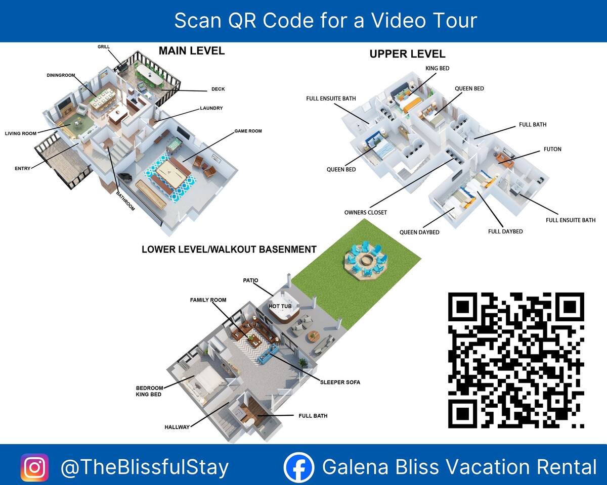 At Galena Bliss, the days unfold effortlessly. Start with coffee on the deck as the hills wake around you, then head out for shopping, golfing, hiking, or a stroll by Lake Galena. Back at the house, the lower-level multi-purpose room is a perfect gathering space for board games and a movie, while the garage game room brings out everyone’s competitive side and provides convenient storage for your golf clubs or ski gear. When evening comes, choose your rhythm: a soak in the hot tub under the stars, a glass of wine by the electric fireplace in the living room, stories shared around the outdoor firepit, or quiet time in one of the cozy bedrooms. Guests also enjoy access to resort-style amenities at the Owners’ Club, including a seasonal outdoor pool, year-round indoor pool, fitness center, sports courts, and scenic trails. ⭐ Amenities You’ll Love ⭐ -Private hot tub on the patio -Massage chair -Fire pit with Adirondack seating, we provide fire wood -Fully equipped kitchen for group meals -Private Game & movie rooms for family fun -Basketball hoop in the driveway -Access to the Galena Territory Owners’ Club (indoor & seasonal outdoor pools, basketball, tennis, fitness center, game room, seasonal craft room & more) • Scenic Lake Galena for boating & fishing • Shenandoah Riding Center for horseback adventures • 30+ miles of trails through protected greenspace ❤️ Click the Heart icon to save this home to your wishlist! 🏡 Spread across three levels, Galena Bliss is thoughtfully designed for both gathering and unwinding. • Main Level – The heart of the home, with a cozy living room featuring an electric fireplace, a fully equipped kitchen, and a dining area that opens onto the deck — perfect for morning coffee or evening meals outdoors. This level also includes the garage, transformed into a private game room with convenient storage for golf clubs or ski gear. • Lower Level – A multipurpose room for gathering, movies, listening to records, and board games, plus walkout access to the backyard where you’ll find the hot tub and firepit — the ideal spot for evenings under the stars. ✨ Bedrooms & Baths 🛏️ Five cozy bedrooms provide versatile sleeping arrangements for families and groups. ✔️ Upper Level – Four bedrooms: • Primary Bedroom – King bed with luxury Helix mattress & ensuite bath • Bedroom 2 – Queen bed with Helix mattress • Bedroom 3 – Queen bed with Helix mattress • Bedroom 4 – Queen daybed, Full daybed, and futon (ideal for kids or flexible sleeping) ✔️ Lower Level – One bedroom + multipurpose room: • Bedroom 5 – King bed with Helix mattress • Multipurpose Room – Sleeper sofa (“short queen” size) for additional guests 👉 Each bedroom is equipped with a Roku smart TV, mirror, luggage rack, alarm clock, and hangers for your convenience. 👉 With four full bathrooms (2 ensuites) mornings run smoothly—even with a full house. ✨ Game Room: Your own private game room located in the garage — temperature controlled with on-demand heating and air conditioning, so it’s comfortable year-round. Perfect for fun after hours or when you’d rather stay in: • Massage chair for relaxation anytime you wish • Pool table that converts into a ping-pong table • Shuffleboard that also doubles as a bowling game • Foosball table • Wall-mounted games like backgammon and tic-tac-toe • Two-hole practice putting green for golfers to sharpen their skills • Roku smart TV • EV charger and storage for golf gear and more • A fun “Meet Me in Galena” neon sign for photo ops ✨ Other ways to play: board games, 🕹️Arcade with 12 classic games (Ms PAC-MAN, Galaga, Dig Dug & more), Plinko Game, 🪓 Axe Throwing, 🏐 volley ball & cornhole for the back yard, 🏀 basketball in the driveway, and more! ✨ Location Our home is just: 📍7 minutes to the Owners’ Club (pools, fitness center, courts, game room) 📍 6 minutes to Eagle Ridge’s North Golf Course 📍 7 minutes to Lake Galena’s marina for boating and fishing 📍11 minutes to Shenandoah Riding Center for horseback adventures 📍11 minutes to historic downtown Galena with its shops, dining, and history 📍24 minutes (15 miles) to Chestnut Mountain Ski Resort for winter fun and Mississippi River views 📍 40 minutes (28 miles) to Mississippi Palisades State Park 📍 1 hour 4 min (46 miles) to Field of Dreams Movie Site ✨ Why You’ll Love It Here Whether you’re planning a wine-tasting weekend, a family holiday, or a relaxing getaway, our home puts you at the center of it all. From eagle watching at Lake Galena to browsing Galena’s 19th-century Main Street, every day offers something new to discover. ✨ Book your stay today and experience the perfect balance of relaxation, recreation, and Galena charm.